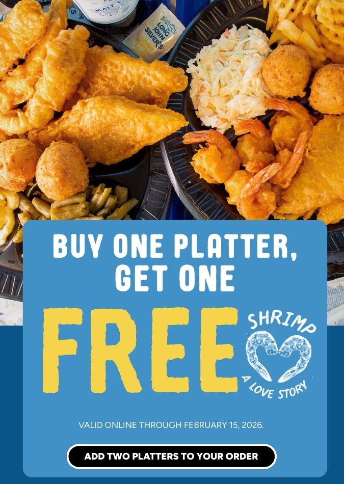 Buy one Platter and get one free with a Long John Silver’s promo code valid through February 14. Start an online order here, get the two Platters into your cart, and use code PLTRBOGO at checkout. Long John Silver’s sent this message with the code.