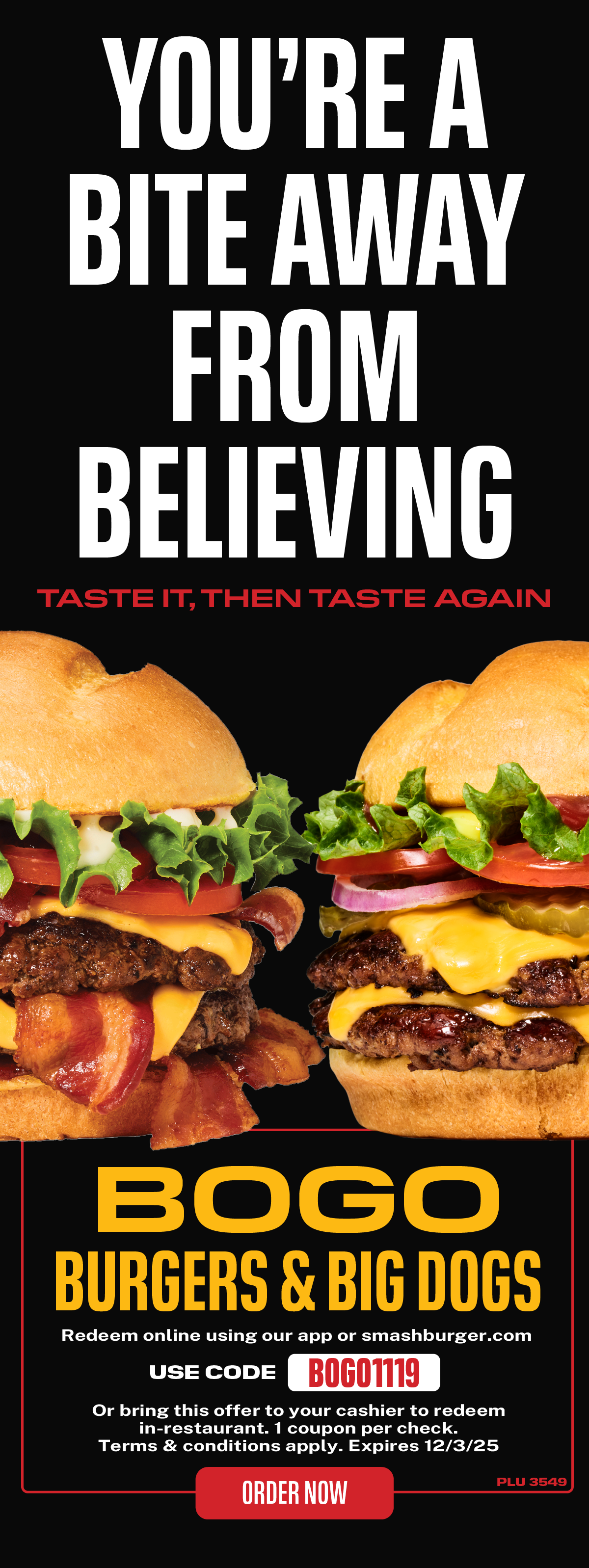 Buy one Burger or Big Dog and get one free with a Smashburger coupon valid through December 3! Or, try the $4.99 Value Menu, or a free Kids Meal on Wednesdays.
